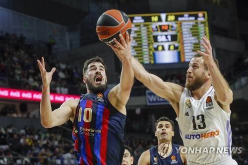 epa10431606 Barcelona's Nikola Kalinic (L) in action against Real Madrid's Sergio Rodriguez (R) during the Euroleague basketball match between Real Madrid and FC Barcelona, in Madrid, central Spain, 26 January 2023. EPA/Juan Carlos Hidalgo