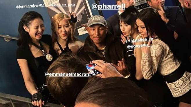 게시된 사진 속에는 나란히 서 있는 블랙핑크와 퍼렐과 함께 이들을 열심히 찍어주는 누군가의 뒷모습이 담겼는데, 그는 다름 아닌 에마뉘엘 마크롱 프랑스 대통령이었습니다.
