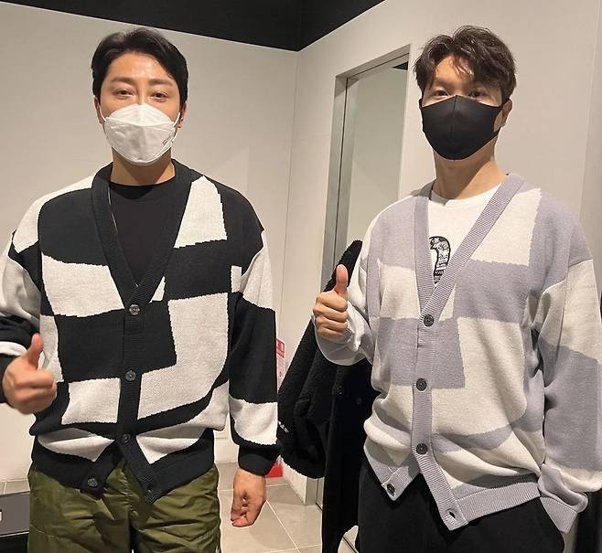 사진 속 손헌수는 박수홍과 색상만 다른 가디건을 입고 커플룩 인증샷을 남기고 있다.