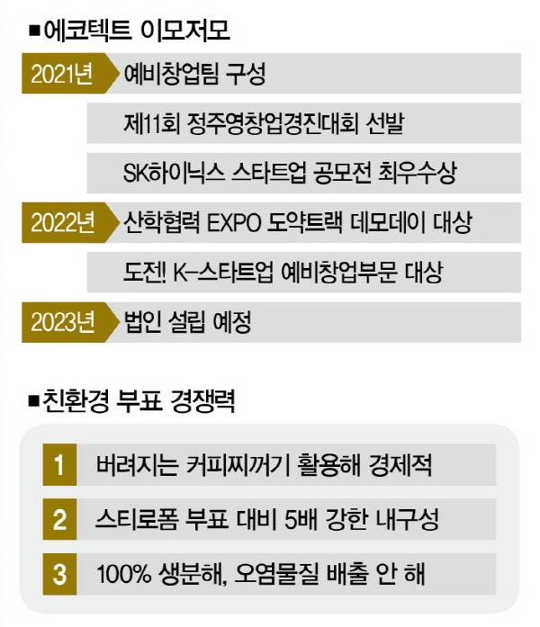 아직은 예비창업팀이지만 아이템이 독특하다. 버섯균사와 커피찌꺼기를 활용해 바다에 띄우는 친환경 부표浮漂를 개발했다. 이를 알리기 위해 얼마 전엔 미국 라스베이거스에서 열린 'CES(국제전자제품박람회) 2023'에도 참가했다. 스타트업 에코텍트 얘기다.