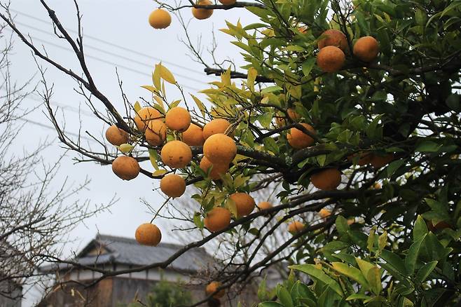 | ▲ 하기시 성하마을 주택가의 감귤나무 에도시대 말기부터 심기 시작했다고 한다. |