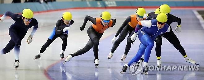 (서울=연합뉴스) 김인철 기자 = 정재원(9번)이 27일 오후 서울 노원구 태릉국제스케이트장에서 열린 제104회 전국동계체육대회 스피드스케이팅 남자 일반부 매스스타트 경기에서 질주하고 있다. 2023.1.27