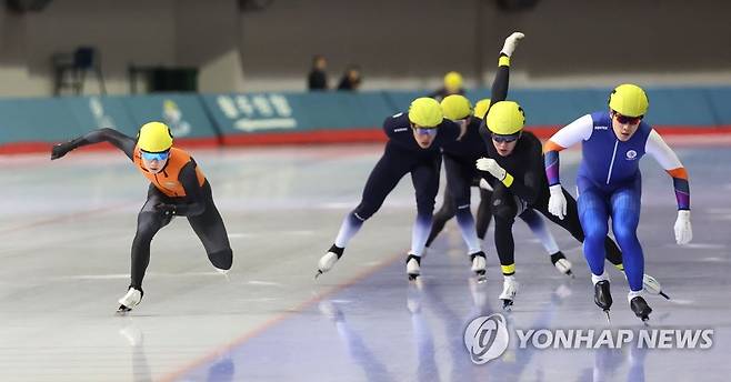 (서울=연합뉴스) 김인철 기자 = 정재원(9번)이 27일 오후 서울 노원구 태릉국제스케이트장에서 열린 제104회 전국동계체육대회 스피드스케이팅 남자 일반부 매스스타트 경기에서 질주하고 있다. 2023.1.27