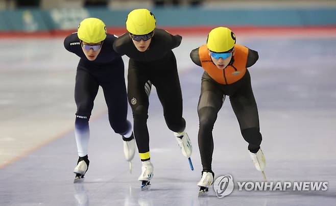 (서울=연합뉴스) 김인철 기자 = 정재원(오른쪽)이 27일 오후 서울 노원구 태릉국제스케이트장에서 열린 제104회 전국동계체육대회 스피드스케이팅 남자 일반부 매스스타트 경기에서 질주하고 있다. 2023.1.27