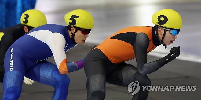 (서울=연합뉴스) 김인철 기자 = 정재원(9번)이 27일 오후 서울 노원구 태릉국제스케이트장에서 열린 제104회 전국동계체육대회 스피드스케이팅 남자 일반부 매스스타트 경기에서 질주하고 있다. 2023.1.27