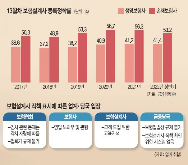 금융당국 역시 보험사들의 이런 영업 관행을 제재할 마땅한 법적 근거가 없다는 입장이다. 금융감독원 관계자는 “현재 시스템상 보험설계사의 이름과 소속 등은 조회할 수 있지만 그들이 자체적으로 부여받은 직위나 직책은 확인할 길이 없다”고 말했다. 또 다른 관계자는 “보험업법에 설계사의 직위·직책을 별도로 다루는 부분이 존재하지 않는다”며 “가입자가 이로 인해 피해를 입었다고 생각되면 형법상 사문서위조죄로 설계사를 고발하는 수밖에 없다”고 설명했다.