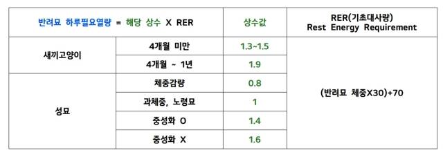 먼저 ①반려동물의 몸무게를 ㎏ 단위로 측정하고 이어서 ②기초대사량을 구합니다(기초대사량=체중×30+70). 여기에 ③반려동물의 상태에 따른 상수를 곱한 값(기초대사량×상수값)이 일일 권장 열량입니다. 이 때 상수는 고양이의 상태에 따라 0.8~1.6으로 달라집니다.