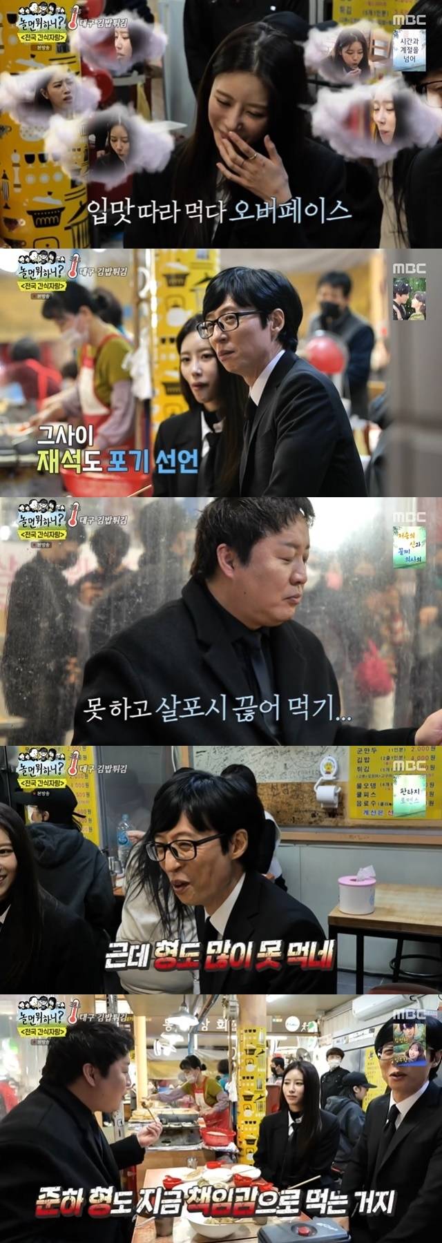 유재석은 "준하 형도 지금 책임감으로 먹는 거지 배가 다 찼다. 아까 내가 봤는데 어묵을 '스읍'하면서 (눈치 보더라)"고 계속 놀리더니 "형 책임감으로 먹지 마라. 이제 그만 먹으라"고 만류했다.