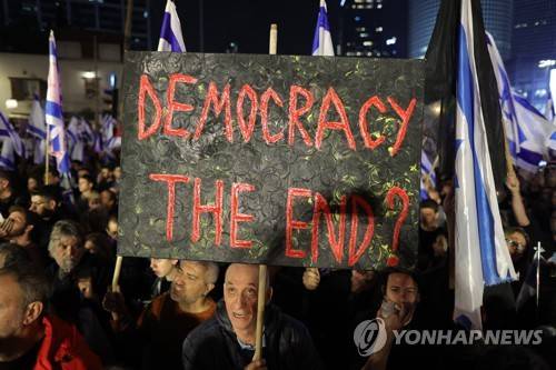 epa10436670 People take part in a protest against the new government in Tel Aviv, Israel, 28 January 2023. Thousands gathered to protest against the newly-formed government of Prime Minister Benjamin Netanyahu amid reports of government's intention to reform judicial system which critics say would weaken the power of the Israeli Supreme Court. EPA/ABIR SULTAN
