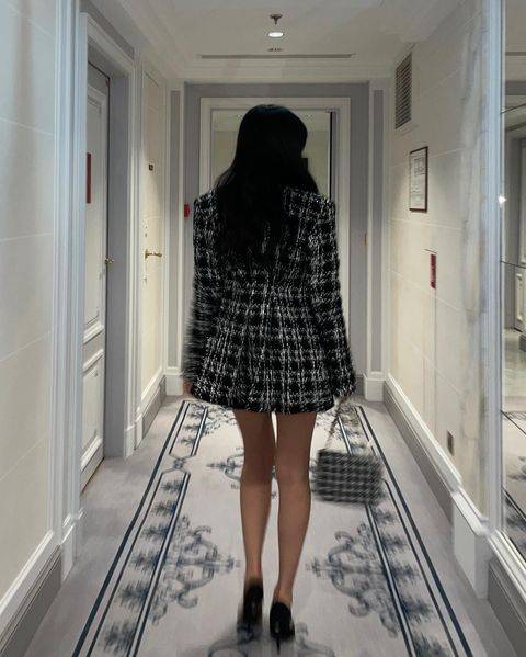 체크무늬 자켓에 검정색 미니스커트를 차려입고 굽이 높은 구두를 신은 채 복도에서 멋들어진 포즈를 취한 제니다.