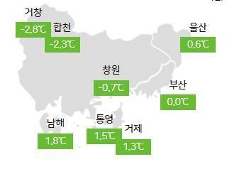 오늘(29일) 낮 최고기온은 부산 7도, 울산 6도, 경상남도 5~7도로 어제(28일, -1~4도)보다 3~6도 높겠으며, 평년(6~9도)보다 1~3도 낮겠다.