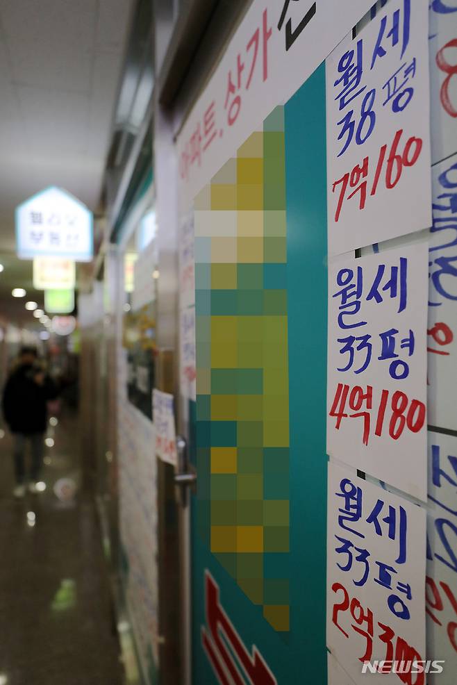 [서울=뉴시스] 백동현 기자 = 금리 인상에 전세 사기 등의 우려가 커지면서 월세 선호 현상이 일어나고 있다. 지난 26일 대법원 등기정보광장에 따르면 지난달 서울 주택 임대물건 중 월세 비중은 57%를 기록했다. 이는 지난 5월 이후 7개월 만에 가장 높은 것이다. 사진은 29일 오후 서울 시내 한 공인중개사 사무소에 붙은 월세 안내문. 2023.01.29. livertrent@newsis.com