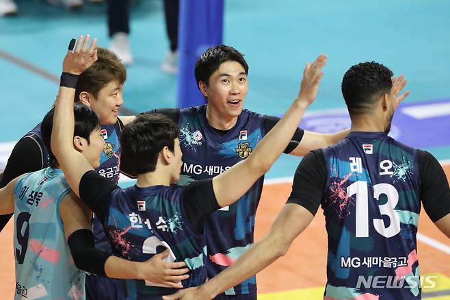 [인천=뉴시스] 김금보 기자 = 29일 오후 인천 삼산월드체육관에서 열린 도드람 2022~2023 V-리그 올스타전 경기, M스타팀 선수들이 기뻐하고 있다. 2023.01.29. kgb@newsis.com