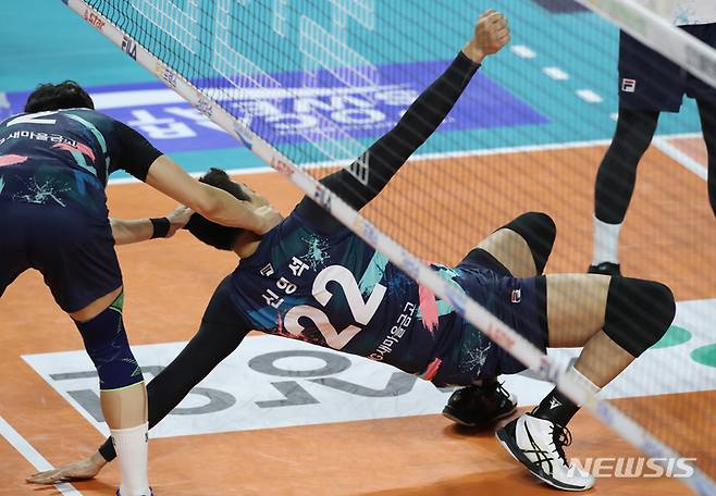 [인천=뉴시스] 김금보 기자 = 29일 오후 인천 삼산월드체육관에서 열린 도드람 2022~2023 V-리그 올스타전 경기, 신영석이 익살스러운 세레모니를 하고 있다. 2023.01.29. kgb@newsis.com