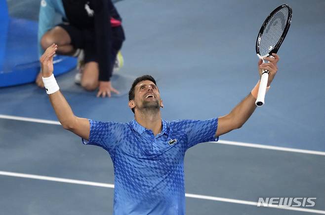[멜버른=AP/뉴시스] 노바크 조코비치(5위·세르비아)가 29일(현지시간) 호주 멜버른의 로드 레이버 아레나에서 열린 2023 호주 오픈 남자 단식 결승에서 스테파노스 치치파스(4위·그리스)를 물리친 후 기뻐하고 있다. 조코비치는 세트 스코어 3-0(6-3 7-6<7-4> 7-6<7-5>)으로 치치파스를 물리치고 남자 단식 사상 처음으로 이 대회 통산 10번째 우승을 차지했다. 2023.01.29.