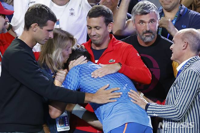 [멜버른=AP/뉴시스] 노바크 조코비치(5위·세르비아)가 29일(현지시간) 호주 멜버른의 로드 레이버 아레나에서 열린 2023 호주 오픈 남자 단식 결승에서 스테파노스 치치파스(4위·그리스)를 물리쳐 우승한 후 어머니 디야나(왼쪽 두 번째)로부터 축하받고 있다. 조코비치는 세트 스코어 3-0(6-3 7-6<7-4> 7-6<7-5>)으로 치치파스를 물리치고 남자 단식 사상 처음으로 이 대회 통산 10번째 우승을 차지했다. 2023.01.29.