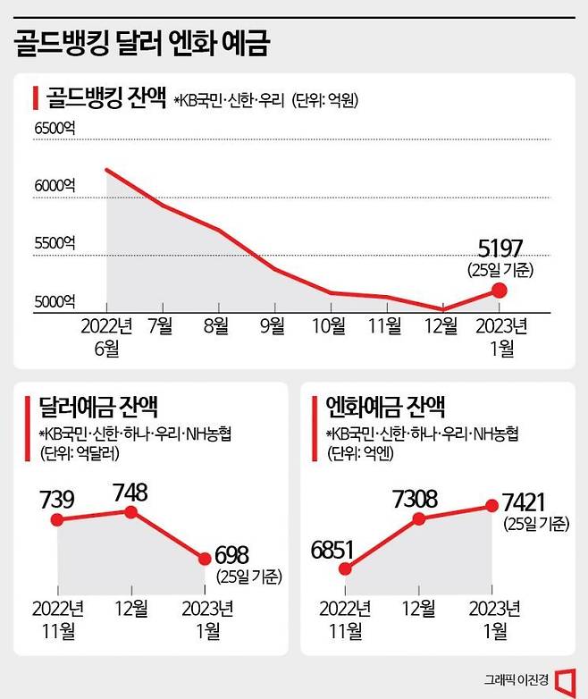 이런 상황을 반영한 듯 주요 시중은행의 외화예금 잔고는 빠르게 줄어들고 있다. 지난 25일 기준 5대 시중은행(KB국민·신한·하나·우리·NH농협)의 달러화 예금 잔액은 698억달러로 집계됐다. 이는 전월 말(748억 달러) 대비 6.7% 감소한 수치다.