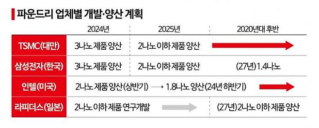 2나노는 첨단 반도체 산업을 이끌고 있는 삼성전자와 TSMC도 2025년 생산을 목표로 세웠을 정도로 높은 기술력이 요구되는 공정이다. 현재 파운드리 시장에서 가장 고도화된 공정은 3나노다. 삼성전자는 지난해 가동을 시작한 3나노 1세대 공정의 수율을 상당 수준까지 끌어올린 것으로 알려졌다. 삼성전자는 지난해 6월 말 세계 최초로 나노 공정에서 칩을 생산, 중국 팹리스(반도체 설계전문 업체)에 전달했다. TSMC는 3나노 칩 양산 시점이 삼성전자에 비해 6개월 정도 늦었다. 지난달 29일에야 대만 남부 타이난과학단지 내 18팹에서 3나노 양산 행사를 열었다. TSMC는 핀펫 기술을 유지하며 3나노 공정을 개발했다. 첫 고객은 애플인 것으로 추정된다.