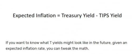 반면에 BEI(Break-Even Inflation)로 불리는 기대인플레이션은 다릅니다. 시장에서 결정되는 국채 수익률과 물가연동국채(TIPS)의 격차를 통해 산출해 좀더 엄밀하다고 할 수 있습니다. 명목 금리(수익률)에서 실질 금리를 빼면 물가상승률이 나오는 것과 마찬가지입니다. 미래 동일한 시점에 만기가 끝나는 국채 금리에서 물가연동국채 금리를 빼면 미래 물가상승률인 기대인플레이션율(BEI)이 산출됩니다.