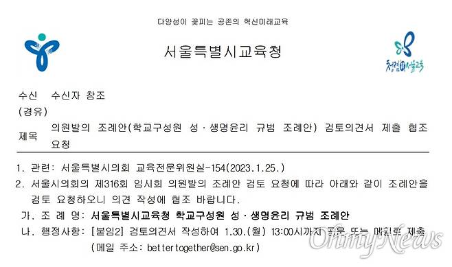 30일 확인한 결과, 서울시의회 교육전문위원실은 지난 25일 서울시교육청에 '서울특별시교육청 학교구성원 성·생명윤리 규범 조례안'에 대한 검토의견을 공문으로 요구했다. 이 공문을 받은 서울시교육청도 지난 1월 27일부터 서울지역 유초중고 학교 전체가 볼 수 있는 업무시스템에 해당 의견조회 공문을 게시했다.