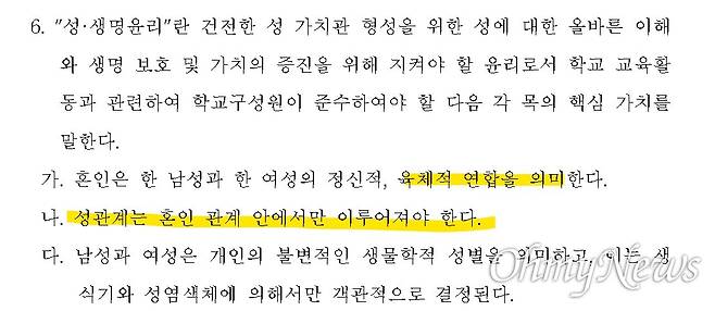 모두 22개조로 된 이 조례안은 "학생, 교직원, 보호자가 성·생명윤리를 존중하는 학교 문화를 조성하는 것을 목적으로 한다"면서 제2조6항에서 '성·생명 윤리'에 대해 다음처럼 정의했다.