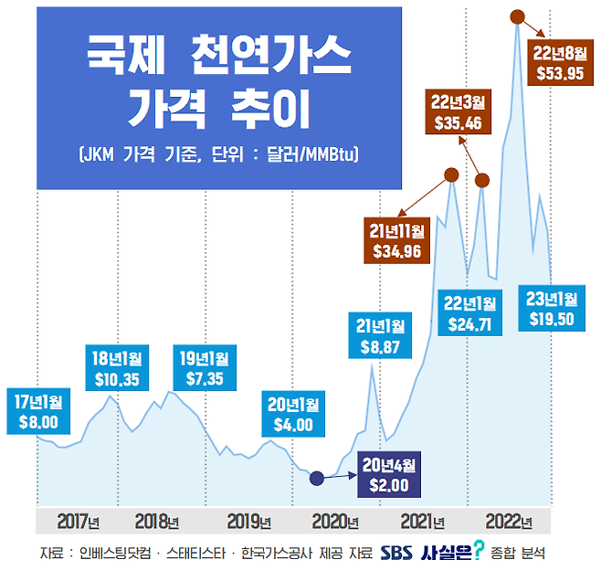 이후 국제 가스 가격은 상승세는 주춤했지만, 지난해 하반기 다시 급등해 지난 8월 정점을 찍습니다. 윤석열 정부 출범 석 달 정도 지난 시점이었습니다. 정부는 이 같은 추세를 배겨내지 못하고 가스 요금을 올렸고, 결국 이번 겨울 국민들은 '난방비 폭탄' 고지서를 받게 됐습니다.