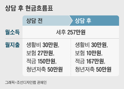 보장성 보험료는 최대 월 10만원을 넘지 않도록 합니다. 결혼 후에도 여성은 특별하게 보장성 보험을 더 추가하지 않아도 됩니다. 보험 리모델링으로 줄인 월 17만원은 적금으로 돌리면 됩니다.