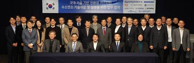 두산에너빌리티는 경기도 성남시 분당두산타워에서 국내 10개 산·학·연이 모여 국산 수소터빈 기술개발 및 실증을 위한 업무협약을 29일 체결했다.