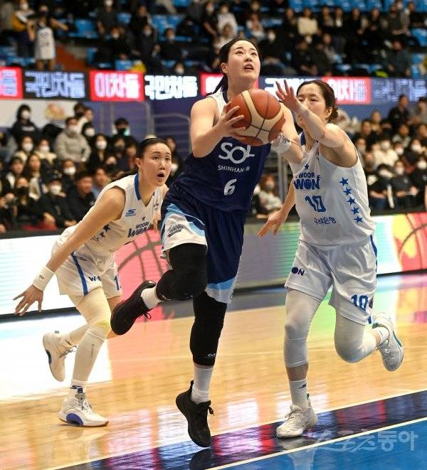 30일 인천도원체육관에서 열린 ‘신한은행 SOL 2022~2023 여자프로농구’ 신한은행과 우리은행 경기에서 신한은행 김아름이 우리은행의 수비를 뚫고 골밑 슛을 하고 있다.