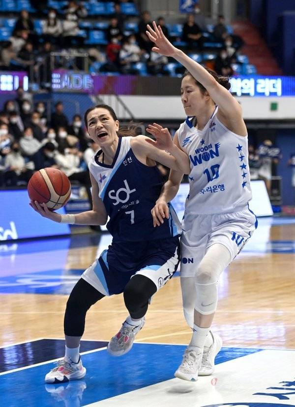 30일 인천도원체육관에서 열린 ‘신한은행 SOL 2022~2023 여자프로농구’ 신한은행과 우리은행 경기에서 신한은행 한채진이 우리은행의 수비를 뚫고 골밑을 공격하고 있다.