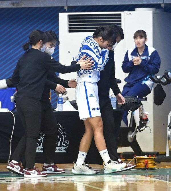 30일 인천도원체육관에서 열린 ‘신한은행 SOL 2022~2023 여자프로농구’ 신한은행과 우리은행 경기에서 우리은행 박지현이 부상으로 교체되고 있다.