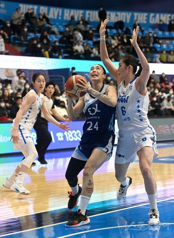 30일 인천도원체육관에서 열린 ‘신한은행 SOL 2022~2023 여자프로농구’ 신한은행과 우리은행 경기에서 신한은행 김소니아가 우리은행의 수비를 뚫고 골밑을 공격하고 있다.