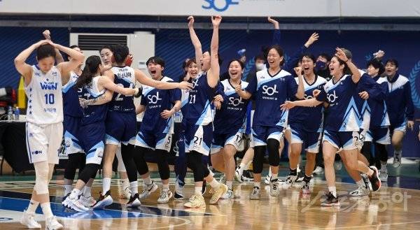 30일 인천도원체육관에서 열린 ‘신한은행 SOL 2022~2023 여자프로농구’ 신한은행과 우리은행 경기에서 74-72 승리를 거둔 신한은행 선수들이 환호하고 있다.