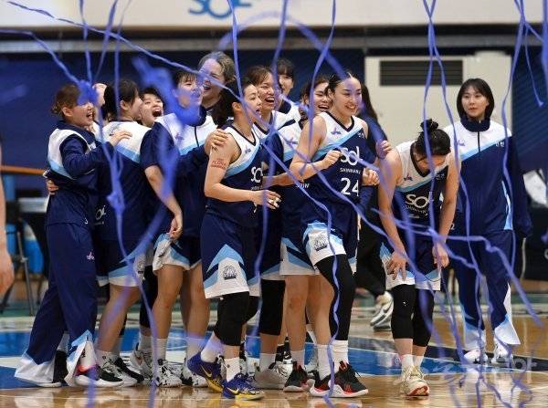 30일 인천도원체육관에서 열린 ‘신한은행 SOL 2022~2023 여자프로농구’ 신한은행과 우리은행 경기에서 74-72 승리를 거둔 신한은행 선수들이 환호하고 있다.