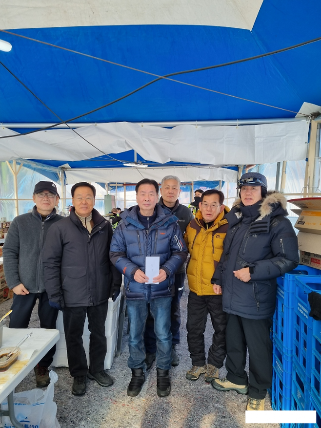 강원 태백시행정동우회 박흠복 회장을 비롯한 회원들이 30일 3년만에 열리고 있는 태백산 눈축제장을 찾아 김용안 전국공무원노동조합 태백시지부장을 비롯해 현장에서 고생하고 있는 공무원들을 격려하고 있다.