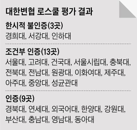 이번 평가는 전국 로스쿨의 최근 5년(2017년 3월~2022년 2월)간 운영 실태를 점검한 결과였다. 기준을 충족해 ‘인증’을 받은 로스쿨이 9곳에 그친 반면, 나머지 16곳 중 13곳은 ‘조건부 인증’, 3곳은 ‘한시적 불인증’ 평가를 받은 것이다. 5년 전 평가에서 23곳이 ‘인증’, 2곳이 ‘조건부 인증’을 받았던 것과 큰 차이가 있었다. ‘한시적 불인증’ 평가는 2009년 로스쿨 도입 이후 이번에 처음 나왔다고 한다. 이번에 ‘조건부 인증’을 받은 13곳에는 서울대, 고려대, 충북대, 전북대, 전남대 등이 포함됐고 ‘한시적 불인증’을 받은 3곳은 경희대, 서강대, 인하대로 나타났다.
