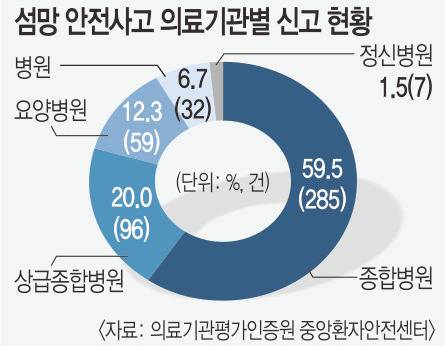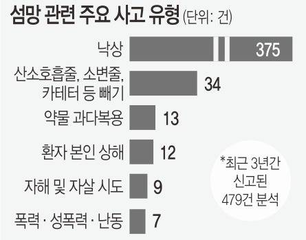 30일 중앙환자안전센터에 따르면 섬망 관련 환자안전사고 신고는 최근 3년간 479건이나 됐다. 해마다 평균 150건 넘게 발생한 것이다. 80세 이상(200건) 70대(152건) 60대(63건) 50대(42건) 40대(14건) 30대(4건) 20대(1건) 순이었다. 사고 종류별로는 낙상(375건)이 가장 많았고 산소호흡줄·소변줄·카테터 등 도관 빼기(34건) 약물 과다복용(13건) 상해(12건) 자해·자살 시도(9건) 폭력·성폭력·난동(7건) 등이 뒤를 이었다. 의료기관별로는 종합병원 59.5%(285건) 상급종합병원 20%(96건) 요양병원 12.3%(59건) 병원 6.7%(32건) 정신병원 1.5%(7건) 였다.