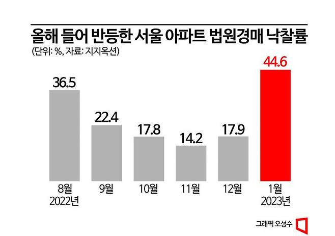 31일 법원경매 전문업체 지지옥션에 따르면 이달 법원에서 경매된 서울 아파트의 평균 낙찰률은 44.6%로 집계됐다. 이는 지난해 12월(17.9%)보다 26.7%포인트 오른 수치다. 지난해 하반기 평균치인 22.57%와 비교해도 2배 가량 높은 셈이다. 낙찰률은 입찰 물건 중 낙찰자가 결정된 물건 수의 비율을 의미한다. 예컨대 낙찰률이 44.6%라면 경매로 나온 10건 중 4.5건이 새 주인을 찾았다는 의미다.