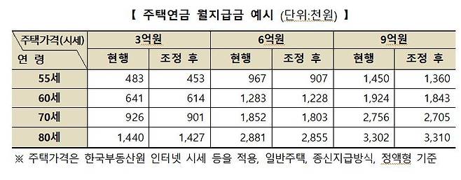 같은 주택가격 기준 60세 가입자의 월 지급금은 128만3천원에서 122만8천원으로, 70세 가입자는 185만2천원에서 180만3천원으로 줄어든다.