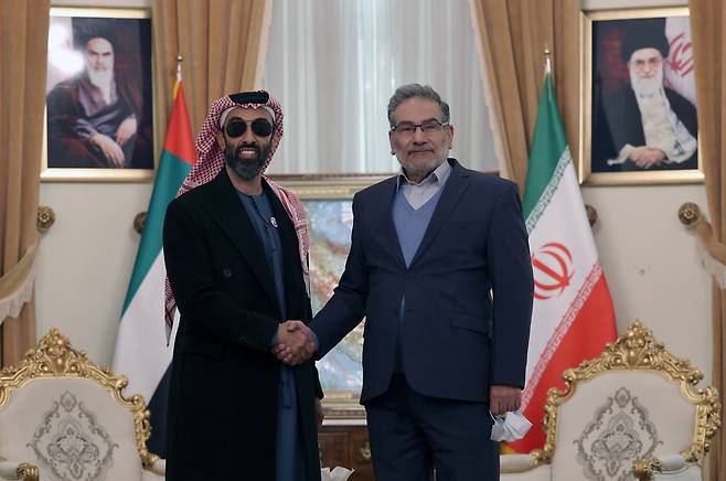 | ▲ 2021년 12월 6일(현지시간) 이란 테헤란에서 알리 샴카니 이란 최고국가안보회의 의장(오른쪽)이 셰이크 타눈 빈 자이드 알 나흐얀 아랍에미리트(UAE) 국가안보보좌관을 만나 악수하고 있다. |