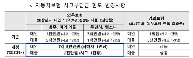 자배법 개정안은 보험사가 의무보험으로 보장해주던 보험금 전액을 개인이 사고 부담금으로 부담하도록 하는 게 핵심이다. 자동차보험은 모두가 예외 없이 가입해야 하는 의무보험과 원하는 사람만 가입하는 임의보험으로 나뉜다. 의무보험은 차 사고를 내면 대인(對人)은 사고 1건당 1억5000만원, 대물(對物)은 2000만원까지 보상해준다. 이전까지는 음주·마약 등 상태에서 운전하다 사고를 내면 사고 1건당 이 금액에서 대인은 1000만원, 대물은 500만원까지만 개인이 사고 부담금으로 물게 했다. 하지만 앞으로는 이 개인 사고 부담금이 대인 1억5000만원, 대물은 2000만원까지 상향됐다. 의무보험 보장 한도까지 사고 부담금 한도가 올라간 셈이다.