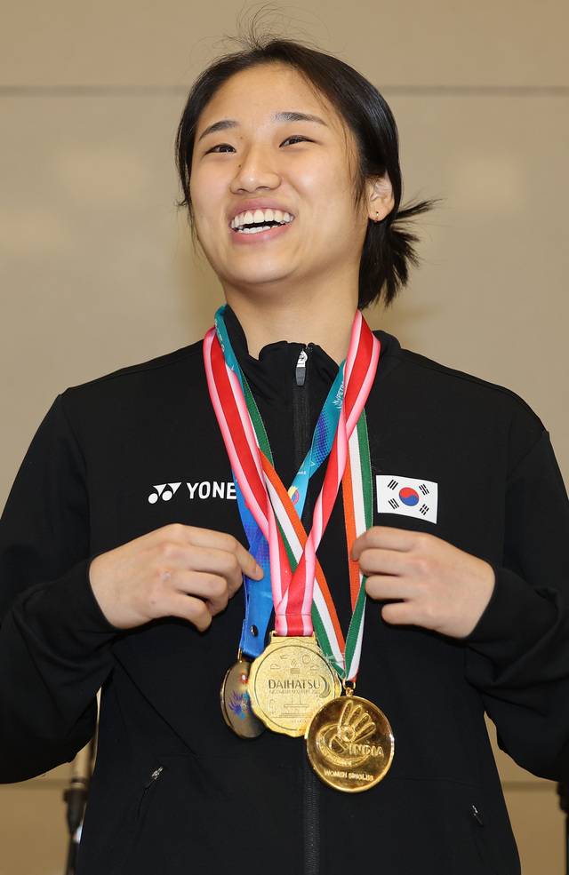 한국 여자 배드민턴 에이스 안세영이 31일 금메달 2개와 은메달 1개를 목에 걸고 인천국제공항 입국장에 서 있다. 안세영은 지난 22일 2023 인도오픈 배드민턴 선수권대회 우승 이후 일주일 만에 또 트로피를 거머쥐며 2주 연속 국제대회 최정상 자리를 차지했다. 연합뉴스