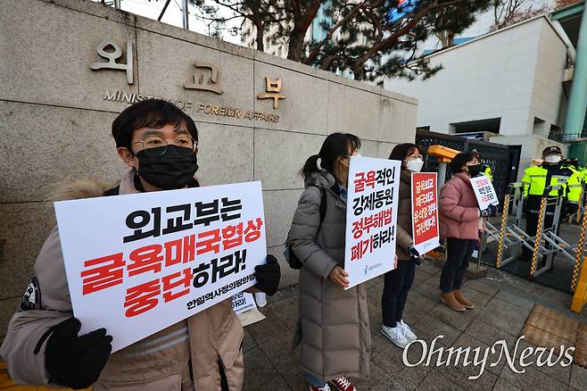 | ▲ 1월 30일 오후 일제 강제동원 피해자 배상 관련 한일국장급 협의가 서울 외교부 청사에서 진행되는 가운데, 한일역사정의평화행동 회원들이 ‘굴욕 매국협상 중단’을 촉구하는 피켓시위를 벌이고 있다. |