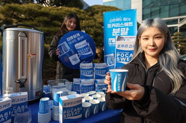1일 서울 용두동 동아오츠카 별관 앞에서 모델들이 분말로 만드는 '따뜻한 포카리스웨트'를 선보이고 있다. 이번 행사는 따뜻한 포카리스웨트를 통해 겨울철 추위와 미세먼지로부터 몸을 보호하고 수분을 충전해주고자 마련됐다.