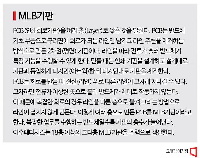 이들 기업이 주문한 제품은 이수페타시스의 주력 제품인 고다층 MLB PCB다. 고다층 MLB 기판은 18층 이상의 다층 구조의 반도체 기판(Mult-Layer Board)을 일컫는다. 이수페타시스는 통신네트워크 장비와 서버 등에 들어가는 고다층 MLB를 주력으로 만든다. 글로벌 빅테크의 인공지능(AI) 투자가 늘면서 MLB 기판 수요도 많이 늘어나는 추세다. 이런 이유로 메타(페이스북) 등도 신규 수요처로 거론된다.