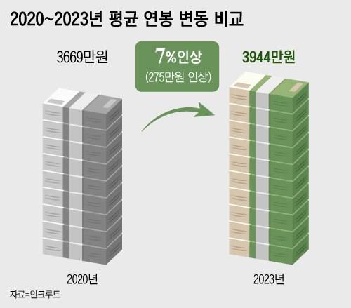 취업포털 인크루트는 ‘2023 공공기관 채용정보 박람회’에 참여한 공공기관 중 연봉 정보를 공개한 135곳을 분석한 결과를 1일 공개했다. 이에 따르면, 올해 국내 공공기관 전일제 신입 평균 연봉은 3944만원으로 집계됐다. 지난해(3824만원)보다 3.1% 인상된 수치다. 2020년(3669만원)과 비교하면 약 7% 올랐다.