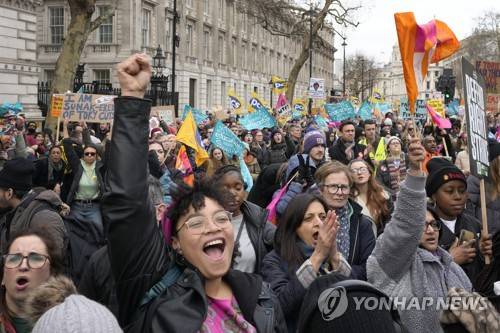 Demonstrators wave banners as they stand in Westminster in London, Wednesday, Feb. 1, 2023. Up to half a million workers are expected to go on strike across the U.K. in what's shaping up to be the biggest day of industrial action Britain has seen in more than a decade. Thousands of schools will close some or all of their classrooms, train services will be paralyzed and delays are expected at airports as teachers, university staff, civil servants, border officials and train and bus drivers walk out of their jobs on the same day. (AP Photo/Kirsty Wigglesworth)