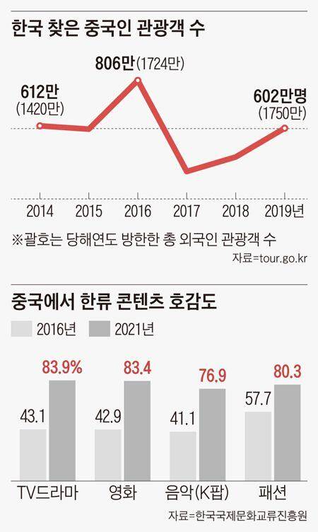 2019년 중국 관광객은 602만명으로 75% 수준을 회복했고, 같은해 방한(訪韓)한 외국인 총관광객은 한한령이 터진 2017년 인원을 420만명 이상 웃돌았다.