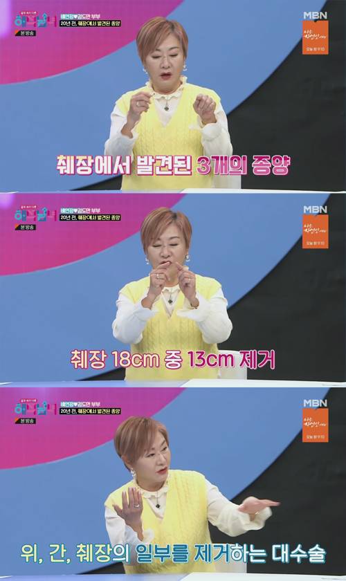 배연정은 이어 "췌장이 18cm인데 머리, 몸통, 꼬리에서 종양 3개가 발견됐다고"라며 "그래서 췌장을 5cm를 남겨놓고 13cm를 잘라버리고, 간도 좀 잘라버리고, 위도 반 자르고 다 잘랐더라고"라고 당시 상황을 설명했다.