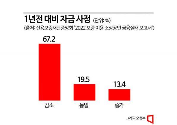 매출은 줄고, 빚은 늘고, 이자까지 오르다 보니 자금 사정은 더 악화됐다. 지난해 대부분의 소상공인은 자금 사정이 '감소'(67.2%)했다. '동일'(19.5%)하거나 '증가'(13.4%) 했다는 응답은 상대적으로 훨씬 적었다. 보고서는 "올해도 (작년 대비) 자금 사정이 '감소'할 것이란 대답이 52.4%였다"며 "해가 갈수록 소상공인들의 주머니 형편이 나빠질 것"이라고 예상했다.